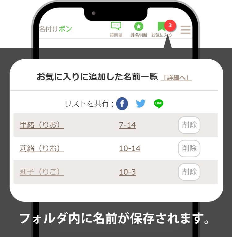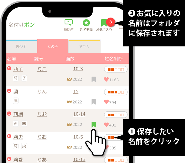 「お気に入り」機能は複数の名前を比較・検討したい時に便利です。