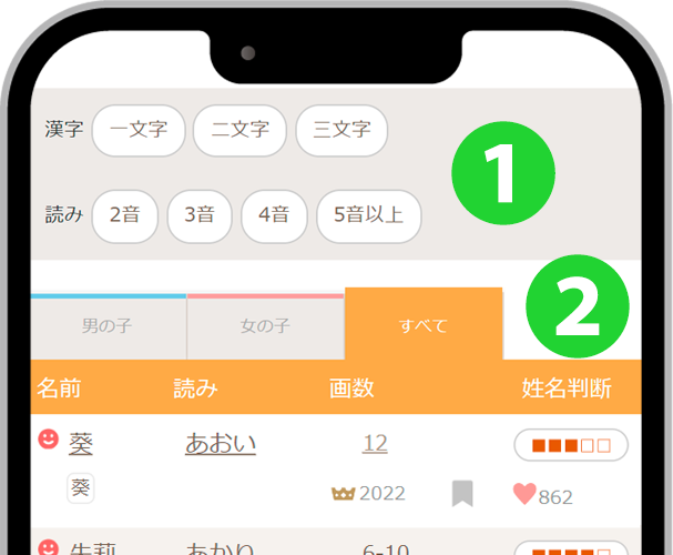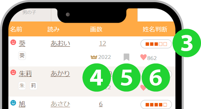 検索結果には、5段階評価で4以上の運勢の名前が一覧表示されます。