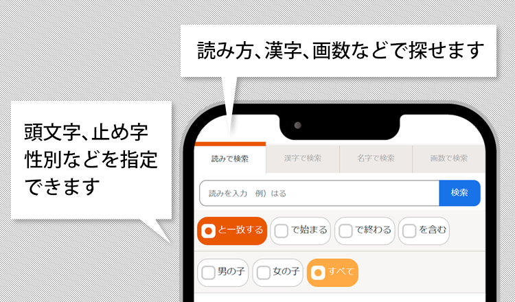 基本となる「読み」「漢字」「名字」「画数」の検索機能の他、検索結果の見方や便利な使い方などをご説明します。