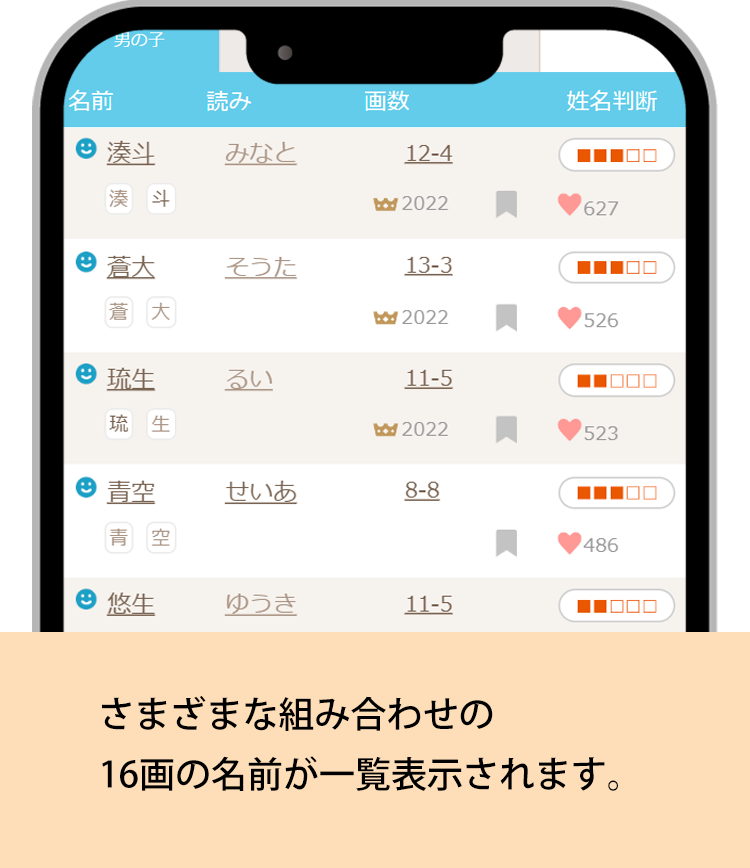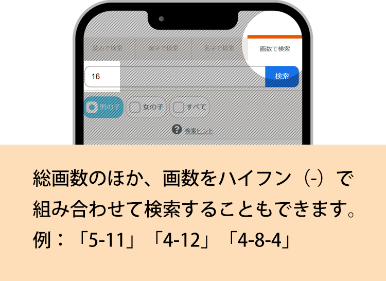 「16」で探した場合、1文字で16画の名前、2文字以上で総画数16画の名前が表示されます。