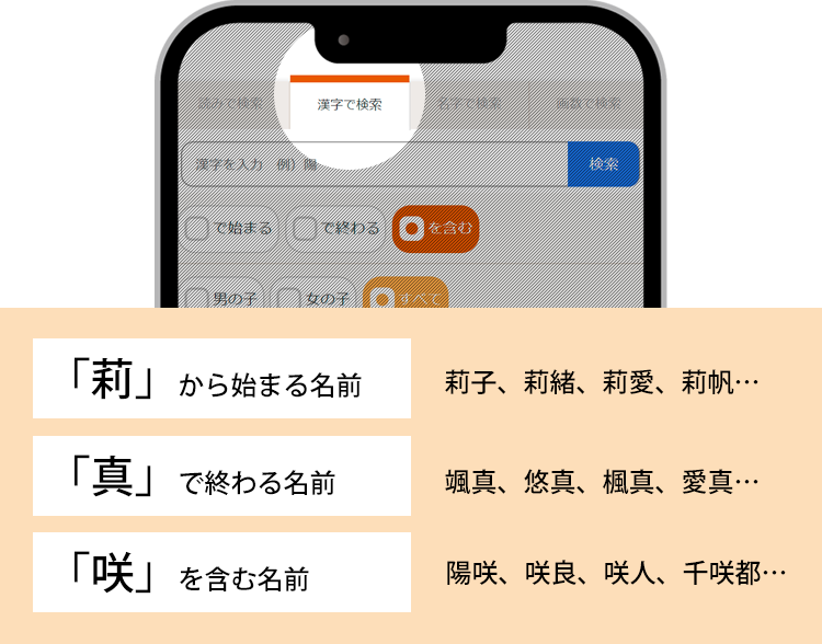 〇で始まる、〇で終わる、など、名前の一部の響きからも探せます。